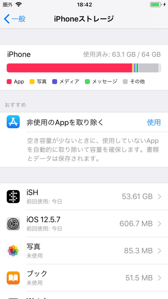 iPhone内蔵ストレージのコンテナの空き領域を、
