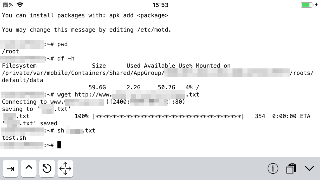 「iSH」を動かして「df -h」で、
